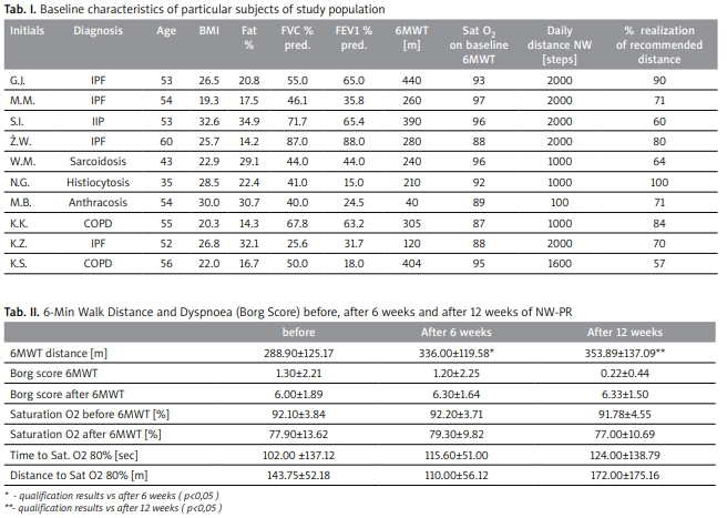 Gracias a ello, los autores esperan que la terapia extrahospitalaria con marcha nórdica fuera parcialmente supervisada. Las guías y la mayoría de los artículos sobre rehabilitación pulmonar demuestran que los resultados de la prueba de marcha de 6 minutos son uno de los principales predictores del efecto de la rehabilitación pulmonar, en lugar de la mejora de la disnea y la calidad de vida [3, 10-12, 15]. Además, la distancia inicial recorrida en una caminata de 6 minutos predice la supervivencia en candidatos a trasplante de pulmón [16, 17]. Martinu et al. [17] demostraron que la mejor supervivencia tras el trasplante de pulmón se observó en pacientes que podían caminar más de 400 m (1200 pies) antes de la cirugía. En nuestro estudio, 3 pacientes (33%) tras la PR-NW aumentaron su capacidad de marcha a más de 400 m. El aumento medio de la capacidad de marcha en nuestro grupo de estudio fue de 64 m. Es similar a los resultados de otros estudios sobre rehabilitación pulmonar en pacientes con enfermedades pulmonares restrictivas. Ferreira et al. informaron un aumento de 56 m en la prueba de resistencia pulmonar de 6 minutos después de 8 semanas de RP en pacientes con diferentes formas de enfermedad pulmonar intersticial [18].