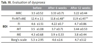 Los resultados de la evaluación de la disnea según el MRC, la prueba BDI y la escala visual de Borg se presentan en la gráfica 3. En el MRC, el BDI y la escala de Borg, se observó una disminución en la percepción de la disnea después de 6 semanas y 12 semanas.