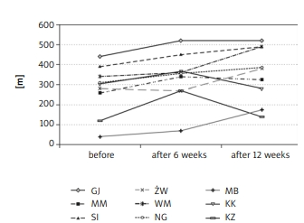 Tras 6 semanas de PR-NW, observamos un aumento estadísticamente significativo de la distancia media recorrida en la prueba de 6 minutos, de 288,90 ± 125,17 a 336,00 ± 119,58 (un aumento de 47,1 m). El aumento más significativo tras 6 semanas (150 metros [125 %)) se observó en el paciente KZ, cuyo resultado inicial en la prueba de 6 minutos fue de 120 metros. Otro paciente, cuyo resultado inicial en la prueba de 6 minutos fue el más bajo de todo el grupo, logró un aumento del 75 % (de 40 a 70 metros). En dos pacientes (20 %) se observó una disminución de la distancia recorrida en la prueba de 6 minutos tras 6 semanas de rehabilitación.
